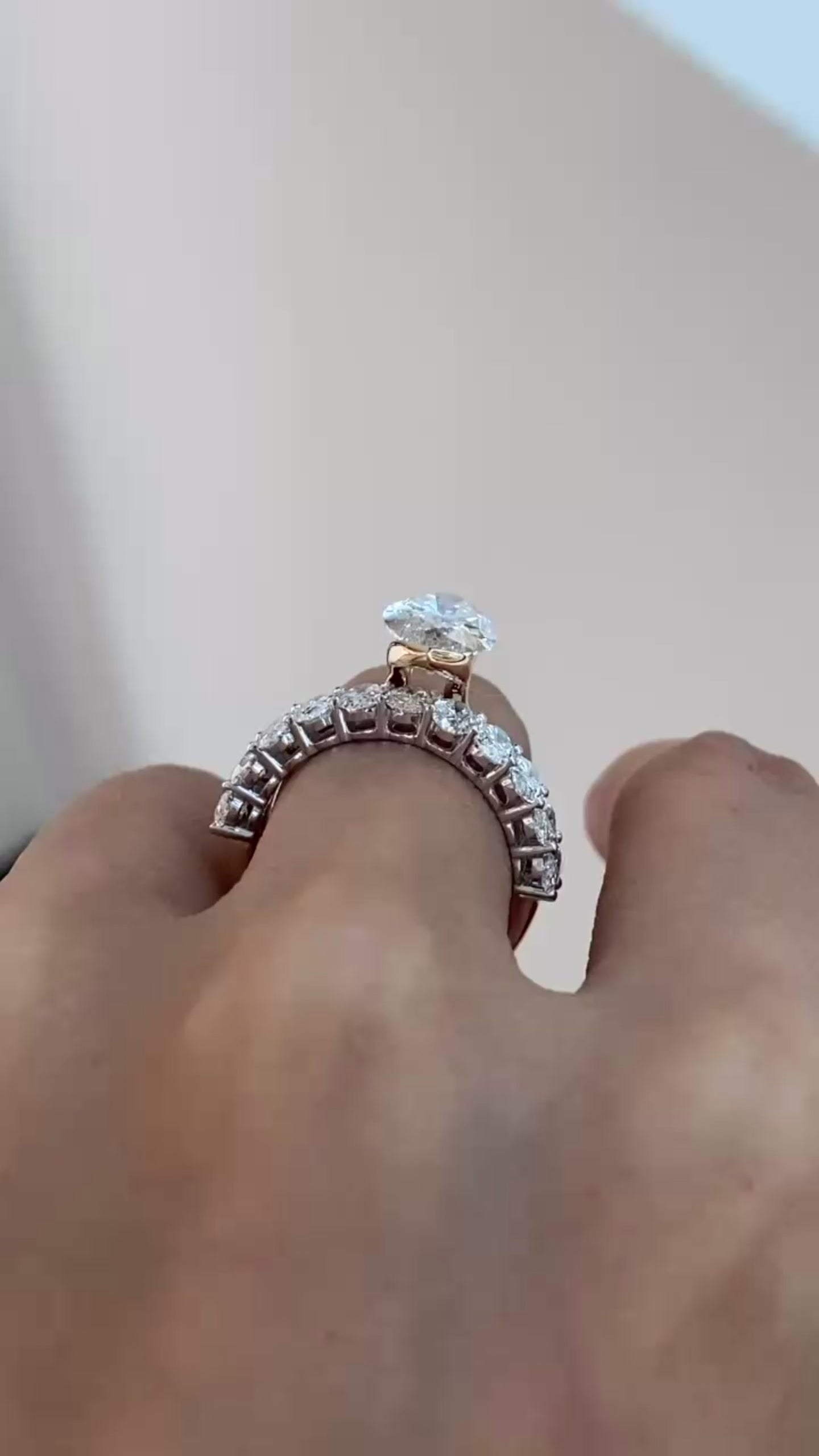 Paired with it is a 6 carat total weight oval three-quarter eternity band, featuring perfectly matched oval stones that wrap the finger in brilliance. The two pieces stack perfectly—soft, elongated shapes paired with warm gold and just the right amount of drama.