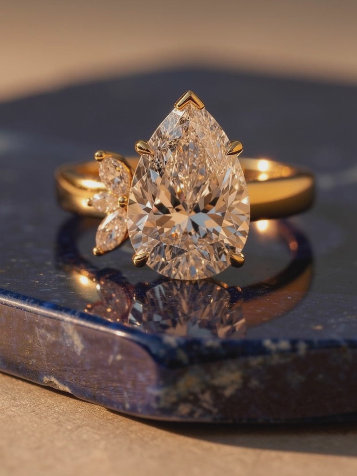 Designed as a one-of-a-kind custom piece, this engagement ring blends bold sparkle with soft, romantic details. The center features a beautifully elongated pear-cut diamond set in warm yellow gold, paired with a delicate trio of marquise side stones that create a floral, asymmetrical moment.
